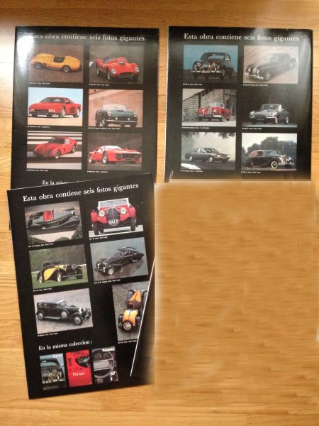 3 carpetas monográficas dedicadas a marcas míticas: 18 láminas, 6 por estuche. Bugatti, Jaguar, Ferrari . Calidad impresionante, habida cuenta de su gran tamaño (A3), por consiguiente, no se despiste. Que otro no las compre primero…